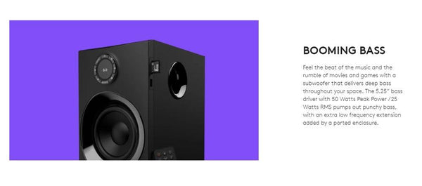 - BOOMING BASS: Feel the beat of the music and the rumble of movies and games with a subwoofer that delivers deep bass throughout your space. The 5.25” bass driver with 50 Watts Peak Power / 25 Watts RMS pumps out punchy bass, with an extra low frequency extension added by a ported enclosure.