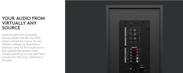 Logitech Z607 delivers true 5.1 surround sound. With 160 watts peak power on tap, this 5.1 speaker system wraps your space in high-quality audio that sounds amazing. Enjoy true surround sound from any source – your TV, phone, computer, games and more via RCA, 3.5 mm auxiliary jack and Bluetooth. You can even play audio content directly off USB drives and SD cards, and listen to FM radio. The 5.25 Inch subwoofer driver pumps out bass you can feel, while the included remote and 6.2-metre extra-long rear cables make it easy to set up and use.