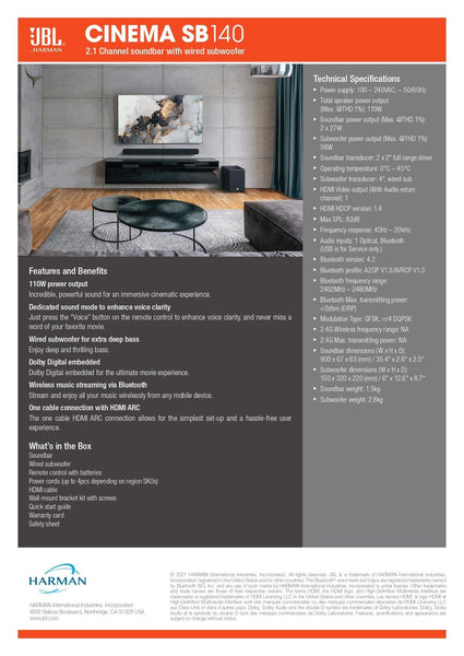 The JBL Cinema SB140 features 110W system power, Dolby Digital, two full range drivers and comes with a wired subwoofer. Enjoy powerful sound with extra deep bass for movies and music entertainment. It’s Bluetooth-enabled so you can play your favorite music wirelessly from any smartphone, tablet or laptop and features a one cable connection with HDMI ARC that ensures a hassle-free user experience.