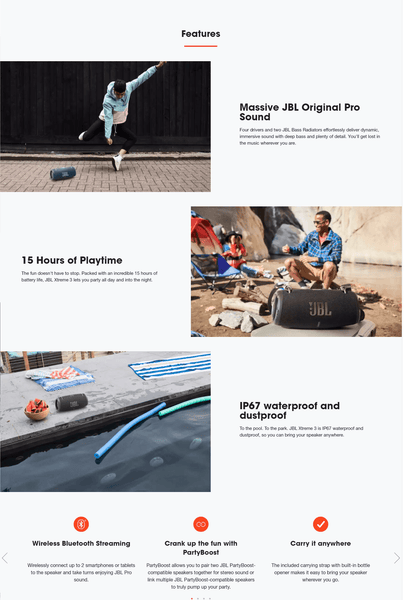 Poolside. Picnics. Just hanging out. Music makes the party. The JBL Xtreme 3 portable Bluetooth speaker effortlessly delivers massive JBL Original Pro Sound. With four drivers and two pumping JBL Bass Radiators, the powerful sound draws everybody in, and with PartyBoost, you can connect multiple JBL PartyBoost-enabled speakers to take things to the next level. A little rain might spoil your fun, but the waterproof and dustproof Xtreme 3 won’t mind at all, and the