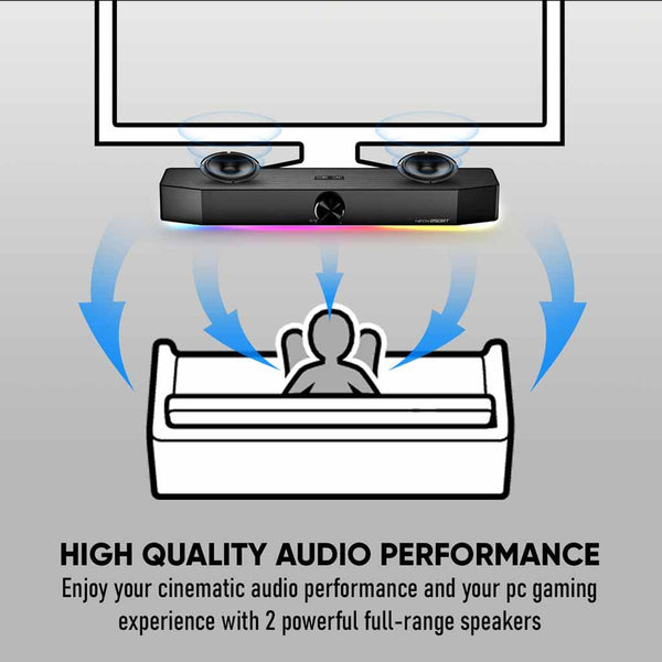 Features: - Bluetooth - 3.5mm Aux-IN - Power USB Input - 20 Watts Max Output Power - 5 RGB Lightning Effect - Multiple Connection - Cinematic Audio Performance - 50mm Short Profile - 1 years warranty